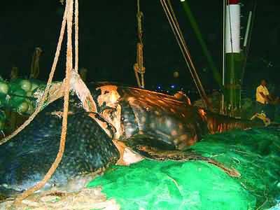 舒师傅向记者介绍说,18日夜里,我们在东海1661海区放下开渔后的第一网,到夜里12时左右起网时,船上12个人一齐拉网,觉得沉甸甸的,当时就有人开玩笑说,不会是条大鲨鱼吧。没想到,几分钟后网拉上来,当尾巴露出水面时,还真是一条鲨鱼,个头还不小呢。