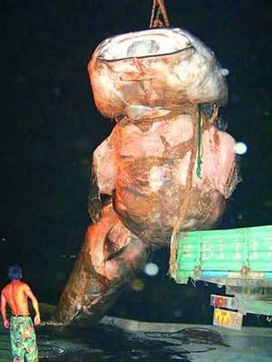 捕获巨鲨的宁波渔船捕捞长舒师傅笑得合不拢嘴,连声说,我捕了二十几年鱼,还是头一次碰到这样的大家伙,估计这条十几米长的大鲨鱼有1万多公斤重呢。