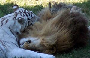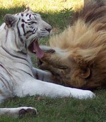 美国佛罗里达州一个公园的狮子和老虎非常的恩爱