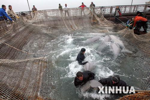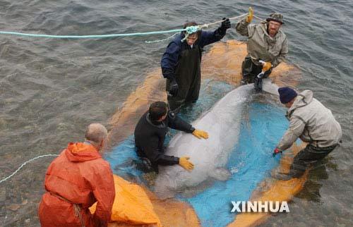10月19日上午,俄罗斯太平洋渔业科学研究中心的工作人员正在捕捉白鲸,准备装箱。