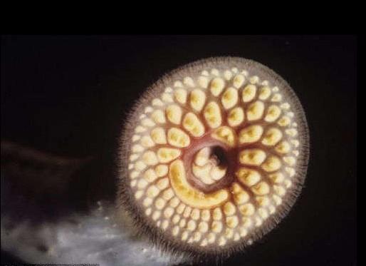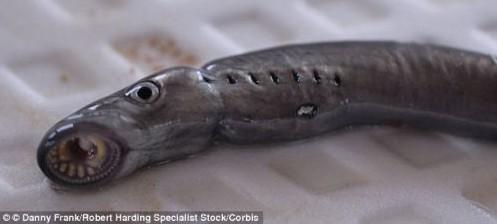 此鱼学名叫做七鳃鳗,其成年后可达0.6到0.9米,虽然形似鳗鱼,但其行动却如水蛭。 七鳃鳗呈圆柱形,嘴如磁盘,还长有利牙。它们贴上其他鱼类之后,便用嘴巴吮吸猎物的血液和其他体液。 据悉,七鳃鳗起源于大西洋,但是它们仍然能够在淡水中生存,并迁移至北美洲五大湖区。