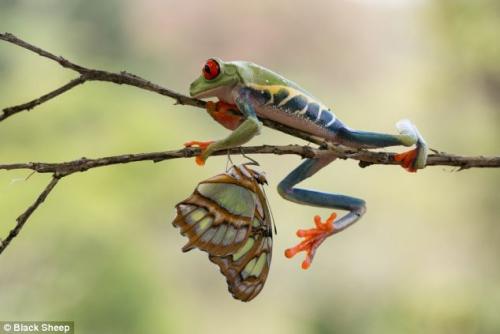 据外媒报道,为了在残酷的自然环境下生存繁衍下去,很多动物都进化出了与周围环境相似的“保护色”,树蛙也不例外。然而,红眼睛树蛙虽然大部分被保护性的绿色覆盖,但却长了一双惹眼的红眼睛和红脚趾,它们通常都在夜间行动。摄影师最近却拍到了一只“行事高调”的调皮树蛙。