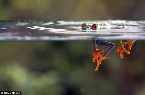 摄影师拍到一只“调皮”的红眼树蛙在水中睁开了眼。