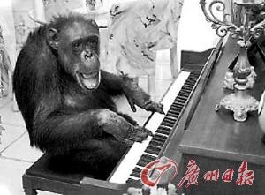 京都大学灵长类研究所研究员服部裕子领导的研究小组训练一只黑猩猩学习弹琴,黑猩猩能够连续30次用手指准确按下两个相隔音符的键。接下来,研究人员反复测试,一面让黑猩猩弹琴,一面让它听各种节奏的拍子,以确定黑猩猩弹琴的节奏是否与它所听拍子的节奏相符。结果发现,黑猩猩弹琴的节奏与一定间奏的节拍相合拍。
