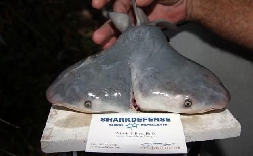 这条双头公牛鲨是被一名渔夫发现的,当时该渔夫切开了一条成年鲨鱼的子宫,发现了这个双头的鲨鱼宝宝,它随后被送到密歇根州立大学做进一步研究。
