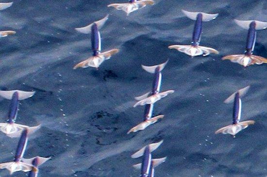 多年以来,许多渔夫和海员都声称看到乌贼在海面上“飞过”,而且偶尔有人幸运的拍摄到一些飞行中的乌贼照片。现在北海道大学的海洋生物学家已经完全发现了这些鱿鱼如何快速喷射水流来推动自己以高达11.2米每秒的速度在空中穿梭,这个速度甚至超过了尤赛恩-博尔特10.31米每秒的最快速度。