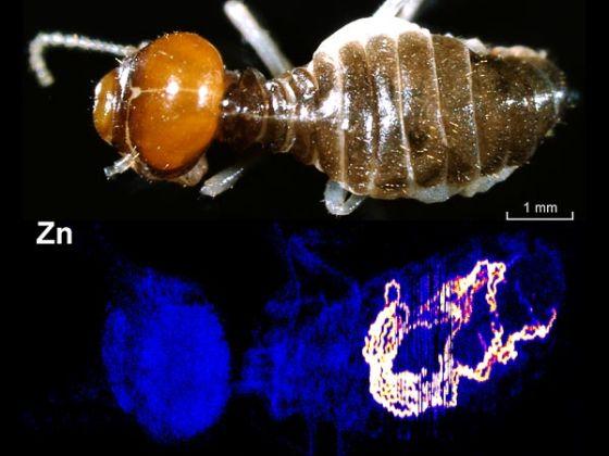 在2011年发表于《PLos ONE》杂志上的一项相关研究中,斯图尔特和同事想要了解白蚁是否也和许多其他动物一样在体内富集金属——这也是寻找贵重金属矿藏的潜在途径之一。就像哺乳动物在骨骼中富集钙元素一样,一些昆虫也会通过吸收锌和镁来加固外骨骼,特别是它们的颚部。锌等金属可以增加这些部位的强度。