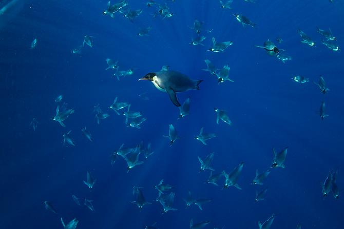 摄影师尼克朗说:“这些企鹅可能从未在水中见过人类,然而只需几秒钟,它们就意识到我对它们并没有构成威胁。它们显得很放松,并乐意让我和它们一同分享这一冰海中的世界。”