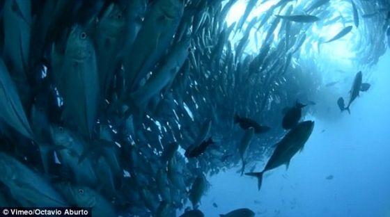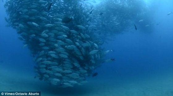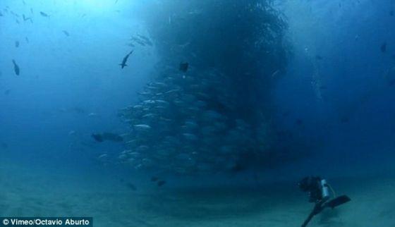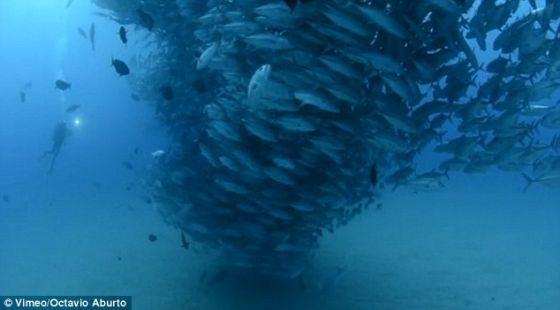 摄影师阿布尔托捕捉到他的朋友兼同是潜水者的卡斯特罗正谨慎靠近这个旋转运动的巨大鱼群。
