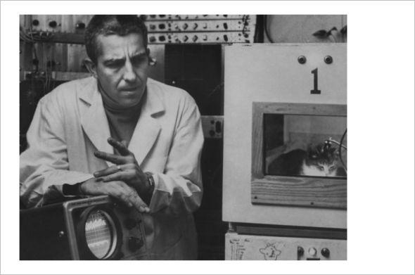 美国著名的睡眠研究学者、斯坦福大学的 William Dement 博士在记录处于睡眠剥夺状态的猫的脑波。可怜的猫咪……(图片:art.com)
