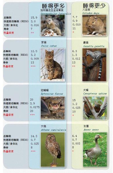 冠蝙蝠(Eptesicus fuscus)一天睡20小时,马一天睡2小时,不同物种的睡眠时长差别甚大。然而,并没有哪一套切实的理论能将睡眠时长与各种生物学因素联系起来。但可以肯定的是:以低能量密度食物为生的物种(如食草动物)要比那些以高能量密度食物为生的物种(如食肉动物)睡得少(如下图所示)。