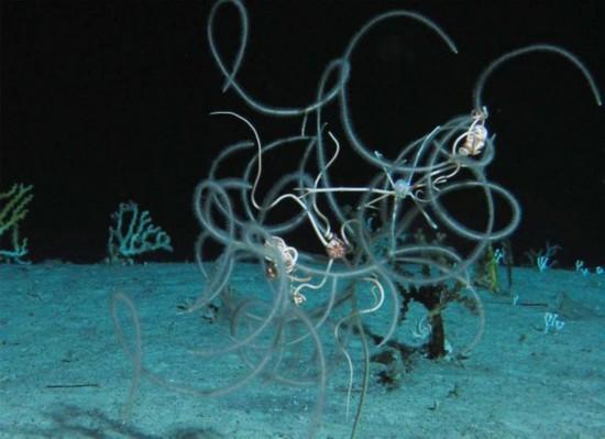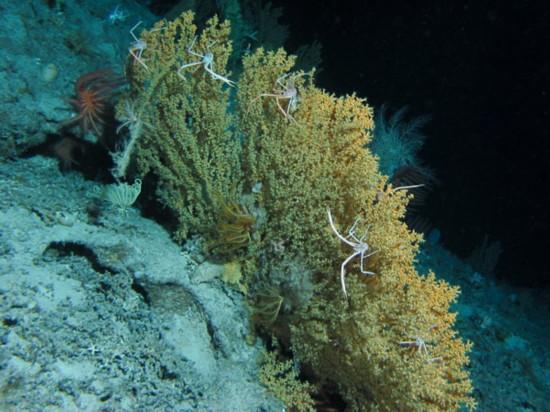 在搭乘潜水器对加勒比海巴哈马群岛海底进行考察时,科学家发现一系列深海发光动物,其中包括海参、海葵、竹珊瑚以及一种新种寄生蟹。