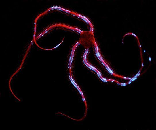 海蛇尾环绕海床上的一只东方扁虾。根据科学家的观察,这只虾趴在发绿光的海葵上,利用长长的爪子捕食粘在海葵上的蓝色浮游生物。它能够看到蓝光和紫外线,因此能够区分美味的蓝色浮游生物和绿色海葵。