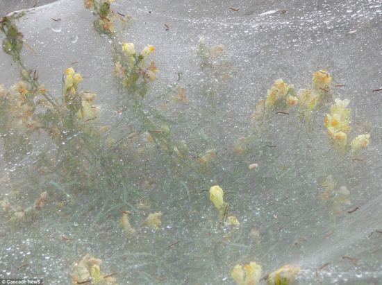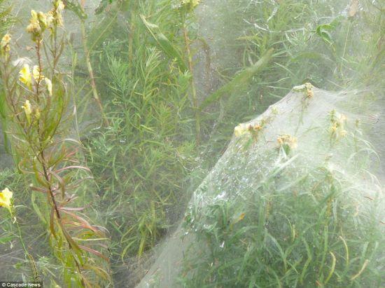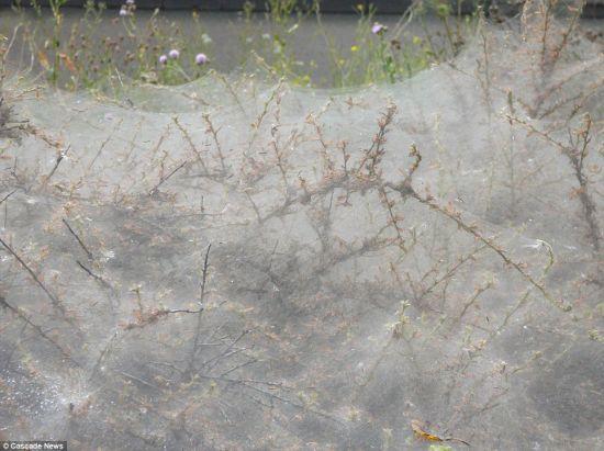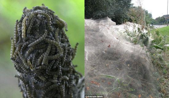 这些令人难以置信的图片显示,在英国东南地区贝尔马什监狱正对面的灌木丛中,数千只毛毛虫仅用两周时间,就结成一张长20英尺(6.10米),宽5英尺(1.52米)的巨网,把它们和灌木都严严实实地包裹起来。这张厚厚的丝网看起来很像塑料,它不仅能够保护这些准备化蛹变成飞蛾的毛毛虫,而且能够保护这些毛毛虫赖以生存的美食。这个巨网为这些长大约1厘米的毛毛虫提供了一个避风港,让它们在化蛹前可以在里面安全进食。
