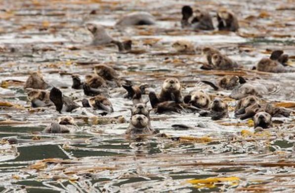 在阿拉斯加科迪亚克岛,水獭聚集在一片海藻床上。图片来源:阿瑟?莫里斯