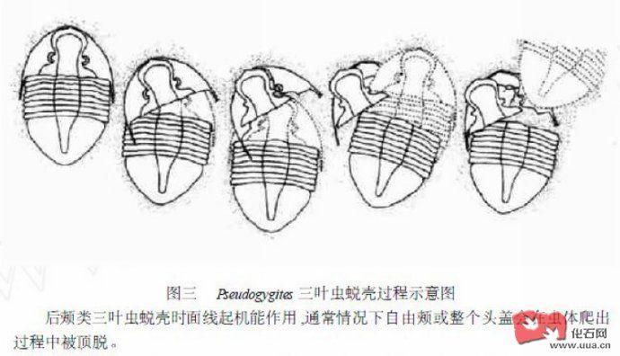 三叶虫蜕壳的方式, 各属是不同的。因此如果研究各式各样的蜕壳, 需要专门为采集蜕壳而工作, 用一定数量的同一属种的蜕壳标本, 经分析研究而确定, 例如: 面线起机能作用, 但蜕壳后自由颊是否有向外翻转, 是否有规律? 在各属表现并不一样。镜眼虫是不是全部是先从头盖后缘裂开? 还是先从尾与胸之间裂开, 各属也不一样。
