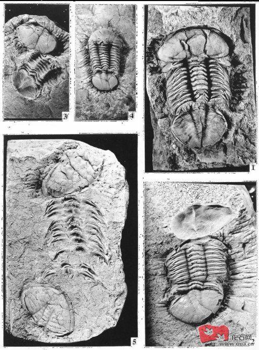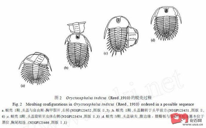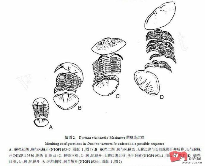 A 、是在统计中出现最多的。主要特征是缺失活动颊, 大部分头盖与胸尾相连, 少部分的标本(约1/ 10) 尾部脱开或者缺失, 还有更少一部分胸节轻微断开。 当面线(面线把活动颊和头盖分开)裂开, 蜕开的活动颊被新的三叶虫背壳顶走, 或被微弱水流(如果不是微弱的水流则可能被冲散为头胸尾散开的标本) 搬运走时, 残存的老壳就剩下“头盖与胸尾相连的”的蜕壳残余的标本。它能够保存这个状态, 也是在老壳的头盖与胸部的连接软组织或韧带似的连接物, 以及胸节之间和胸尾之间的这样的连接物没有腐烂之前就被埋葬了, 而得以保存其各相关的位置。如果说活动颊的脱离发生在若虫死后, 那为什么头盖与第一胸节、各胸节之间以及胸与尾没有脱离呢? 只能说它是蜕壳后被遗弃的老壳比较合理。少部分标本尾部的脱开或缺失, 以及胸部的断开, 应该是与蜕壳过程中的动作及强度有关,这类常见的有莱德利基虫。