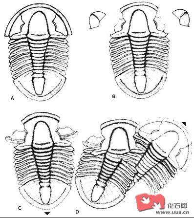 C、头盖、胸、尾相连, 活动颊脱开, 但脱开不远。活动颊裂开, 虫子爬出, 留下老壳, 这是后颊类三叶虫一般的蜕壳方式, 这样的标本反映三叶虫蜕壳已完成, 而且蜕壳的各部件都完整的保存下来, 这只能在蜕壳的瞬间完成, 而且必须是静水的, 在蜕壳后不受任何干扰(物理的, 生物的)而瞬间迅速埋葬才行。这一条件的苛刻, 导致保存标本相对的稀少。