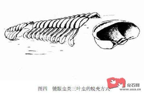 E 、胸尾相连, 头翻转在前或侧,这是Salter 描述的镜眼虫类的蜕壳。后人也有讨论此Salter 式蜕壳的, 这在镜眼虫类的蜕壳时常见, 在广西的泥盆系中Plagiolaria(边眼虫)和Ductina(沟通虫) 的标本相当多, 但真正能保存这样好的状态的则不多。