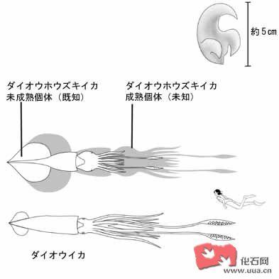 更大的头足类化石被发现并由Kazaushiga Tanabe, Yoshinori Hikida 及Yasuhiro Iba于2006年1月发表公布 , 这具化石是由半块颌部组成并被发现于日本北海道Nakagawa镇 , Wakkaweenbetsu湾中晚白垩纪时期Campanian的沉积物上 。这具头足类化石由黑色磷酸盐物质组成并内含石灰质小瘤 , 沉积物上还有无数的双壳类bivalves及变形的菊石类Polyptychoceras 。化石来自虾夷Yezo上方的泥岩组 , 虾夷Yezo是北海道的旧名字 。这具上颌化石是尺寸长97mm , 阔22.5mm ,拥有较锐利突出的喙并且是成角 , 颌部化石内外存有壳层薄片。