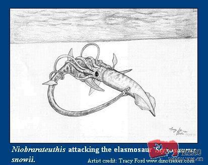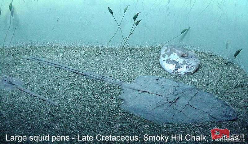 上白垩纪时期即使是在北美 , 管鱿目teuthid的残余化石都是非常贫乏稀少的 , 其中较为普遍的化石样本是trachyteuthid中的 Actinosepia Canadensis 而数目仅只有25个 。史前巨鱿是生活于较浅的西部内海 , 当时辽阔的海道把北美切成两部分 , 把现今北美平原覆盖并贯通至北极圈 。早白垩纪时期全球气候和暖 , 海道底部板块伸展及上升 , 海洋较为浅薄 , 水深少于600尺而底部是平坦多泥的。这海道于生物学上是积极丰富而当时乌贼是最为普遍的动物 , 有五种已被描述了 ,较大的乌贼为Kansasteuthis lindneri 及 Enchoteuthis melanae , 但更大的为邦纳尼奥布拉巨鱿Niobrarateuthis bonneri , 沃克尼奥布拉巨鱿 Niobrarateuthis walkeri 及托斯特巨鱿Tusoteuthis longa。 每种乌贼仅只有单块样本被描述 , 就是来自本身的内壳残余化石 ,这块长度可赶上套膜长度的坚硬棒形物 , 品种的不同来自海标蛸的形状尺寸之差异不同 , 直至最近 , 才把上述的生物归纳为同一种类 。