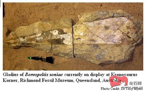 有关史前巨鱿的资料 , 都可从世界其他各地得知 。在澳洲昆士兰的富蒙德Richmond 就出土了一具长1.3米的内壳化石 , 这是由一位年仅十四岁的女孩Sonia Ievers发现的并被取名为索尼亚巨鱿Boreopeltis soniae , 这具化石现正收藏于富蒙德海洋化石博物馆Richmond Marine Fossil Museum 。昆士兰有学生于1998年找到第二具同时代的内壳化石而且长度是超过一米的 , 同时这具化石显示是曾受大型上龙---克柔龙Kronosaurus捕食的。索尼亚巨鱿属Boreopeltis较细小品种的于Heligoland这小岛的白垩纪中期维克特阶(Aptian)黑色泥板岩沉淀物中发现 , Heligoland 是距离德国北方海岸50公里的小岛而当地的泥板岩沉淀物等一米之厚 , 当地并保存了大量的头足类化石例如Mastigophora, Plesioteuthis, Maioteuthis 及Trachyteuthis.