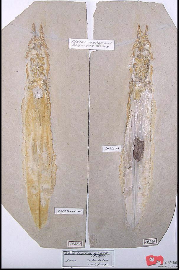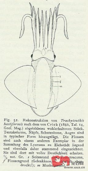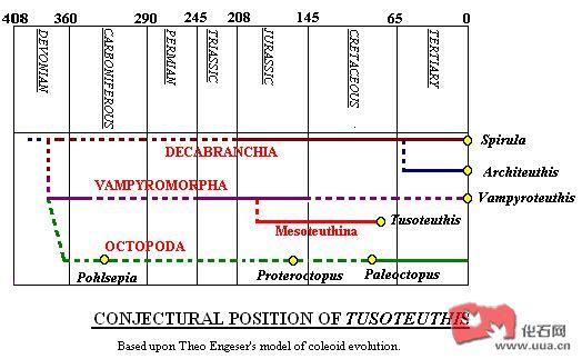 有关这些管鱿目teuthid化石于分类学上过去到现在一直在汇编中 , 基于少量化石的发现 , 乌贼目及其他非箭石类belemnoid的头足类的演化史是非常难以理解。头足类最容易成为化石的部分就是那个壳质的内壳 , 但大多都是难以保存因为内壳特质容易折断 。头足类的演化上的关系大多没得到一致性的认同 , 这存在二至三个不同的演化族谱 , 每个新发现已可重新改写这些资料了 。保存得相当完整的头足类动物群有德国的晚侏儸纪(一亿五千万年前)Solnhofen及Holzmaden沉淀物 , 黎巴嫩的白垩纪(一亿年前)的Hajoula沉淀物 , 及其他少数地区 。这都表现了头足类差异多样性的简单现象 , 罕有及隔离的样本供了一些演化上的线索容许我们估测头足类间发生了什么 , 大部分博物馆化石样本都被标明了管鱿目化石"Fossil Teuthids" 。