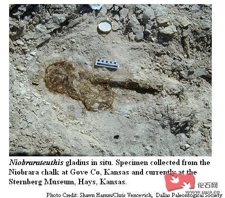 大概有四种乌贼是同时代的 , 管鱿目teuthid的残余于堪萨斯州西南方至加拿大中南部的马尼托巴湖的尼奥布拉拉白垩层 (Niobrara Chalk)被发现而年代达8000万至8500万年前 , 尼奥布拉巨鱿Niobrarateuthis 是于堪萨斯州洛根郡 Logan County冒烟山Smoky Hills的上尼奥布拉拉白垩层被发现的 。另一化石是被发现于白垩层上的皮埃尔泥板岩 Pierre Shale 而且有达7900万年之久 , 托斯特巨鱿Tusoteuthis 的残余就是被发现于堪萨斯州 , 南、北达科他州的皮埃尔泥板岩上 , 另外还有六个样本被发现于加拿大的马尼托巴湖南部 , 这些地层都是位于西部内陆盆地的东部边缘。