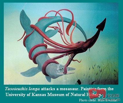沧龙类是被认为会捕食托斯持巨鱿Tusoteuthis 及其他头足类 , 菊石类Ammonites亦多次被报导有沧龙类攻击过的咬痕同时沧龙内脏中发现了管鱿目teuthid的钩 。 全长128厘米的托斯持巨鱿Tusoteuthis内壳收藏于美国科罗拉多州大学博物馆而沿着龙骨rhacis有三个小孔 , 制造这些小孔的力使龙骨rhacis两端分移因而造成龙骨结构上的扭曲 。 小孔空间相当广阔 , 两小孔间距达31厘米而被理解成沧龙从倾斜的角度对托斯持巨鱿Tusoteuthis进行攻击 。沧龙攻击次数是不知的 , 巨鱿的命运究竟是苦斗挣扎逃脱还是身躯受撕裂而套膜及内壳沉于海床中。化石样本是取自皮埃尔页岩Pierre Shale而捕食者被相信是一种相同地层的海王龙属成员Tylosaurus proriger 。