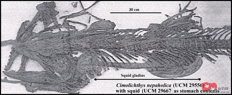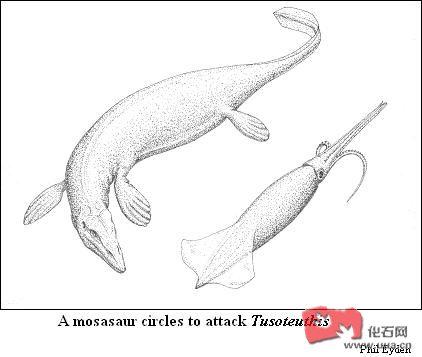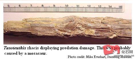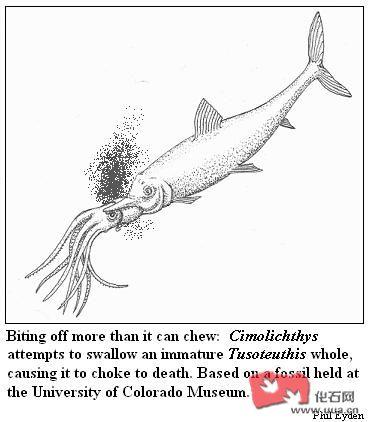 从怀明俄州皮埃尔页岩Pierre Shale发现的两个托斯特巨鱿Tusoteuthis样本看来 , 捕食者身份显然易见 。 从白垩纪的一种掠食性鱼类Cimolichthys nepabolica化石中有一个惊人发现 , 化石内含完整的托斯特巨鱿Tusoteuthis内壳 , 显示Cimolichthys nepabolica是一口吞下托斯特巨鱿Tusoteuthis , 大概是猎物太大而至Cimolichthys nepabolica 窒息气绝。Cimolichthys是早期体型较大的硬骨鱼并可能跟鲑鱼有关 , 类似梭鱼类barracuda般拥有圆锥型及宽阔间距的牙齿以助刺破肉类 , 这是被相信属于迅速具爆发力 , 能持续游动 , 是西部内海最常见的捕食者 。这具Cimolichthys nepabolica 化石样本不完整 , 并保存的部分长152 cm 但内含66cm的内壳 , 属于尚未成熟的托斯特巨鱿Tusoteuthis 。鱿鱼是位于大鱼的胃部而其后方膨胀的内壳则卡在鱼肩部的胸廓部分 , 内壳柄方向是朝向鱼的口部 , 左方的鱼鳃盖下方被破坏 。这看似是Cimolichthys nepabolica从托斯特巨鱿Tusoteuthis幼体后方接近 , 攻击并尝试吞下整头鱿鱼。鱿鱼头部及触须是远离鱼口 , 当时托斯特巨鱿Tusoteuthis幼体可能是尝试挣扎。挣扎的同时导致内壳连同皮肤组织断裂做成鱼鳃内部受破坏 , 最终两者同归于尽而只剩下鱼的食道及鱿鱼的内壳部分 ,这令人震撼的化石样本现存于美国科罗拉多洲大学博物馆。