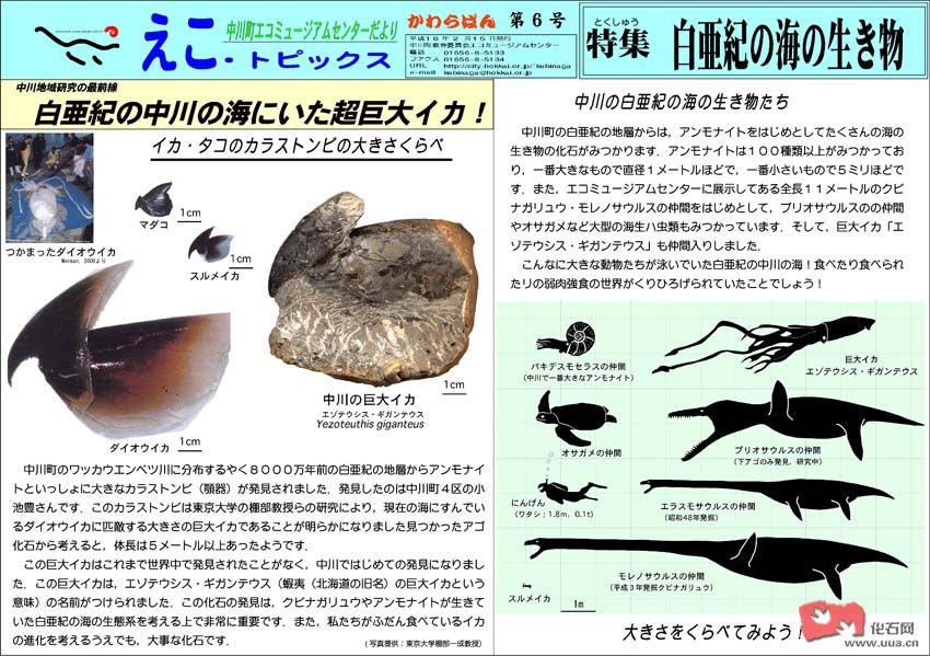 发现者结论这样本属于巨型的新品种并命名为虾夷巨鱿Yezoteuthis giganteus , 生活于晚白垩纪西北太平洋一带而当地存有许多细小的菊石及鹦鹉螺类等有瞉头足类。颚骨化石现存于中川町自然志博物馆