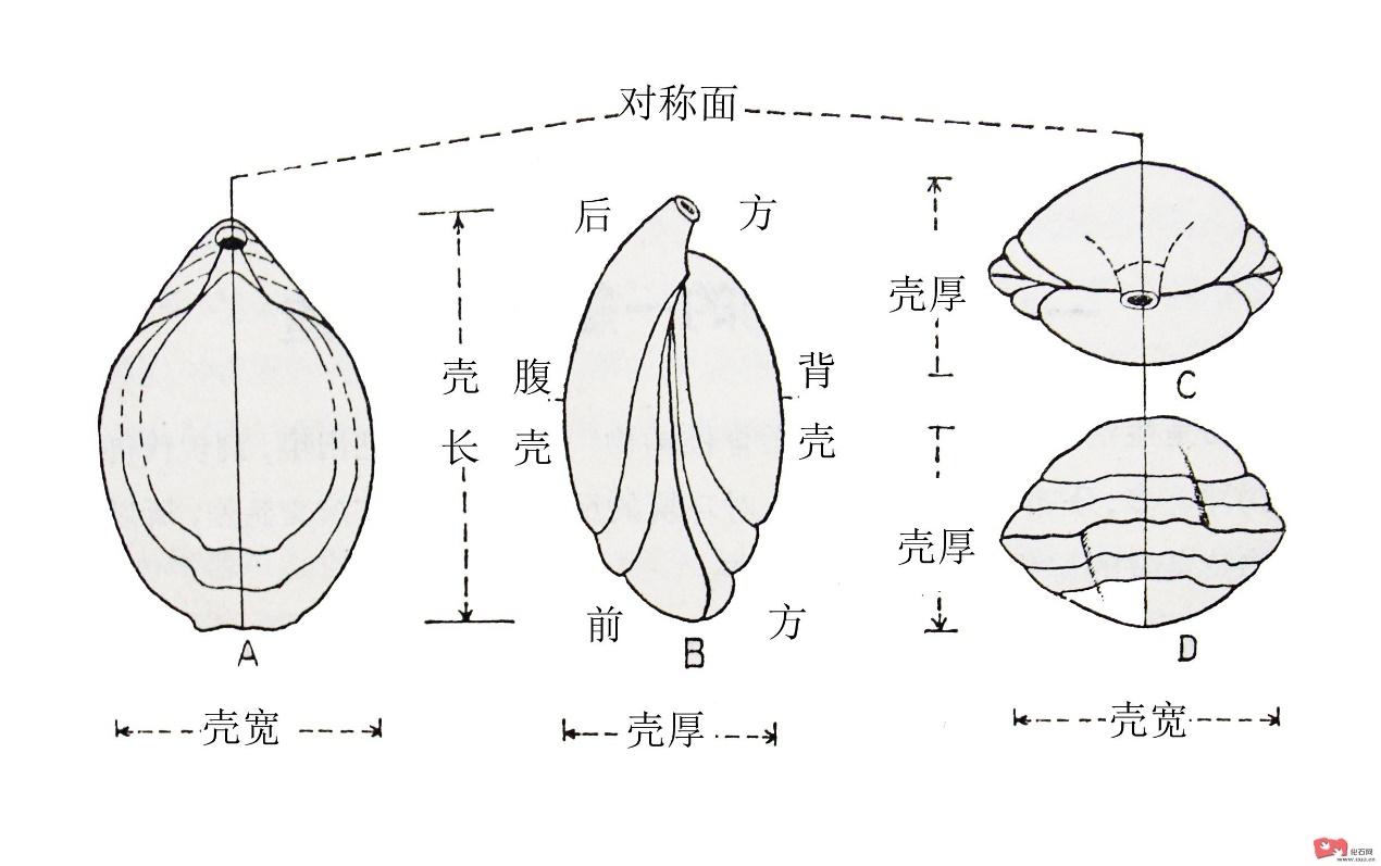 腕足动物贝体的轮廓变化也很复杂。近似方形、圆形、卵形、三角形和椭圆形等等。当贝体长度大于宽度时称长形,宽度大于长度时称阔形。两壳凸度也多变化:两壳凸隆进语相等时为双凸型;背壳凸度远大宇腹壳时为背凸型;背壳近平而腹壳凸隆时为平凸型;背壳凹陷而腹壳隆时为凹凸型;此外还有颠倒型和凸平型。