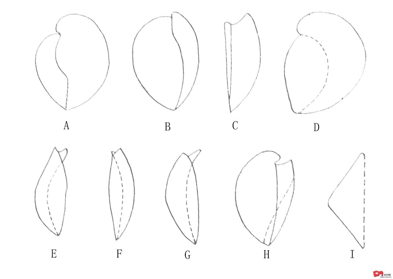 A,B巨窗贝型,C亚穿孔贝型,D,H穿孔贝型,E,F、亚巨窗贝型,G石燕型