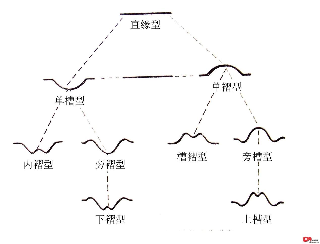 腕足动物两壳在前方的接合线叫前缘。最简单的一类是壳面平滑无饰的双凸型贝体,前缘几乎近于直线,名直缘型。当背壳有个中槽,腹壳有个中隆,以致前缘向腹方弯曲时,名单槽型;反之,当背壳有个中隆,腹壳有个中槽,以致前缘向背方弯曲时,名单褶型;此外还有内褶型、旁褶型、槽褶型、旁槽型、下褶型和上槽型。
