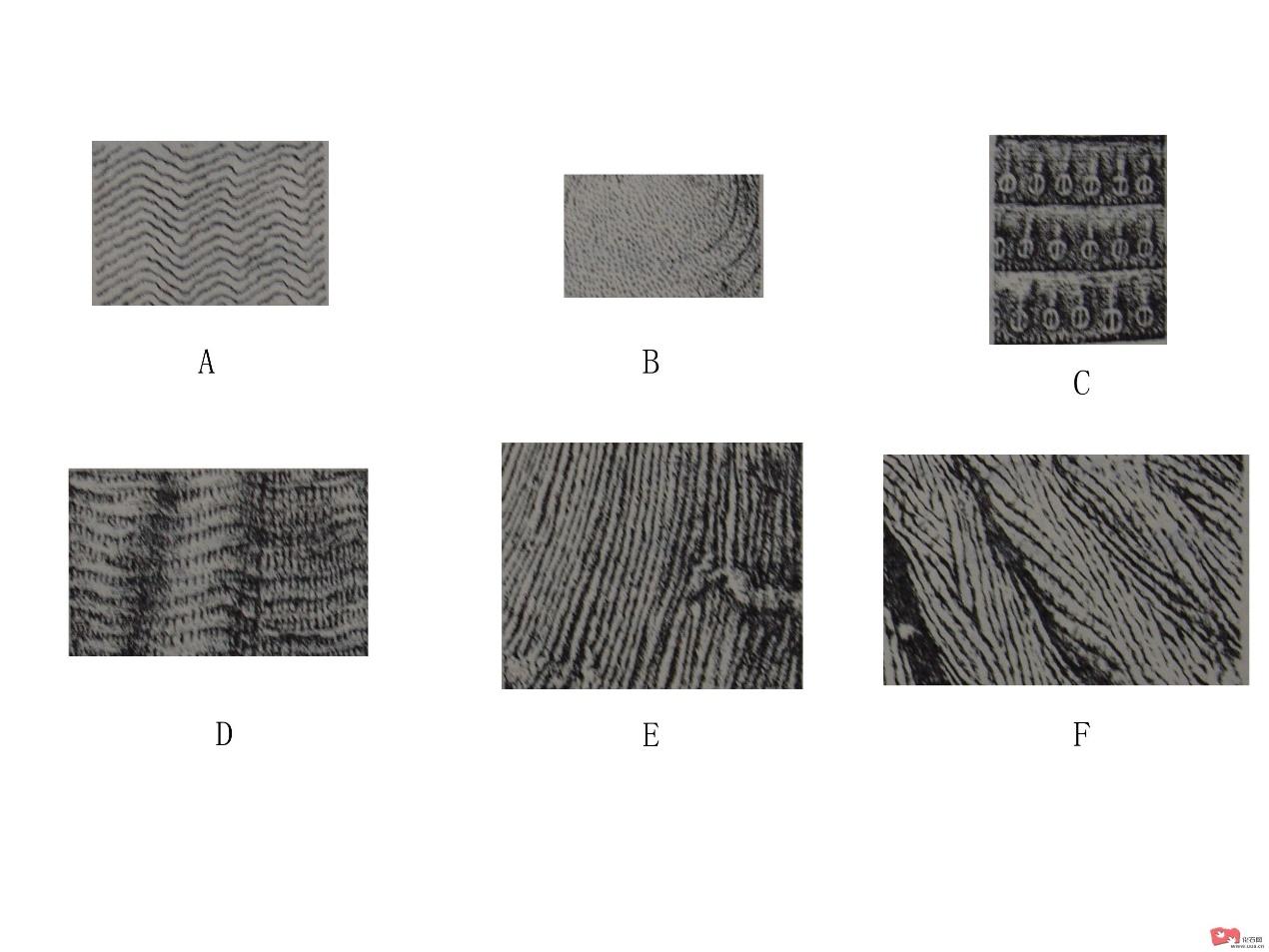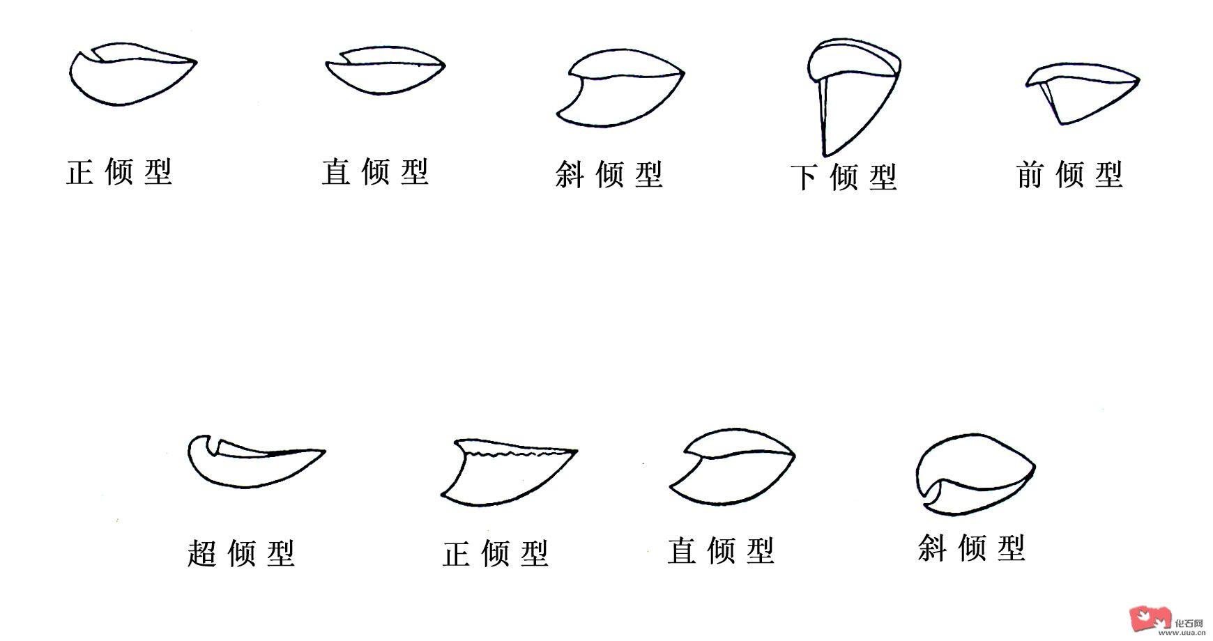 A直伸型,B近直伸型,C近垂直型,D垂直型,E缓弯型,F强弯型
