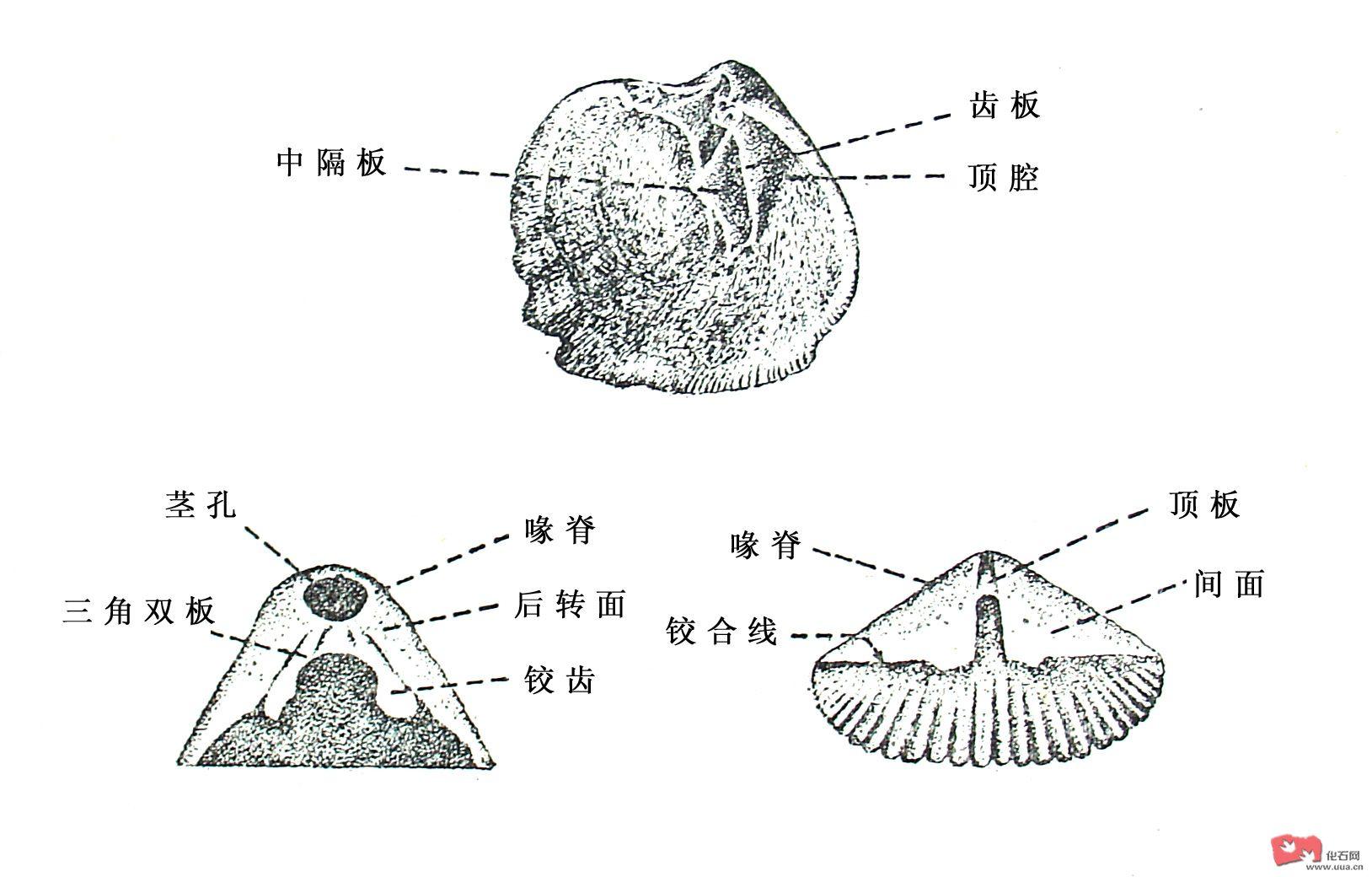 两壳后缘相向汇聚的区域叫作壳顶,有的长的尖耸有的肥肿。当壳顶向后方伸突显著,相当的肿大而弯曲时,这就叫壳喙。小嘴贝和穿孔贝两族中两壳的壳喙的弯曲度,分为直伸型、近直伸型、近垂直型、垂直型、缓弯型和强弯型六种。两壳壳喙都强烈弯曲时,背壳喙经常为腹壳喙掩盖不外露。从壳喙或壳顶沿壳体向两侧延伸,至主端的壳面叫作喙脊。而喙脊的造型是鉴别属种的依据。