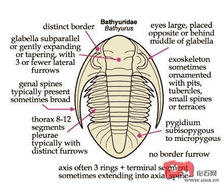 头鞍:砑头虫的头鞍与褶颊虫非常近似,只是眼睛比褶颊虫大很多,头上一般没有很奇特的装饰