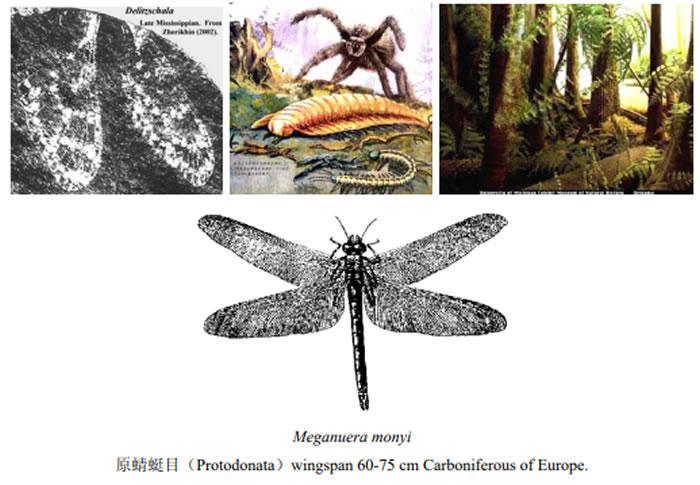 大部分陆地都在热带。除了大蜻蜓外,还有超大的蜉蝣昆虫,巨型的非昆虫节肢动物,如蝎子、千足虫、巨蜘蛛等等。但从二叠纪的中期到晚期,这些巨型物种消亡了,其后代都小型化以适应新的环境。