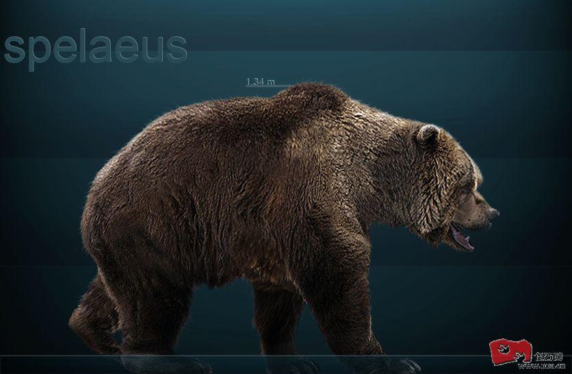 首先是熊属动物,洞熊(Ursus spelaeus)其实没有过去讹传的那样,动不动就一吨的体重,但是绝对也是非同小可。欧洲的雄性洞熊的头骨长度可以有50厘米左右