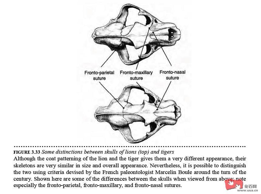 虎和狮的头骨是非常类似的.主要区别就是虎的面颅比例更短而脑颅比例更长,嘴更宽,而且鼻骨的延伸超过上颌骨的最后端.狮子正好相反