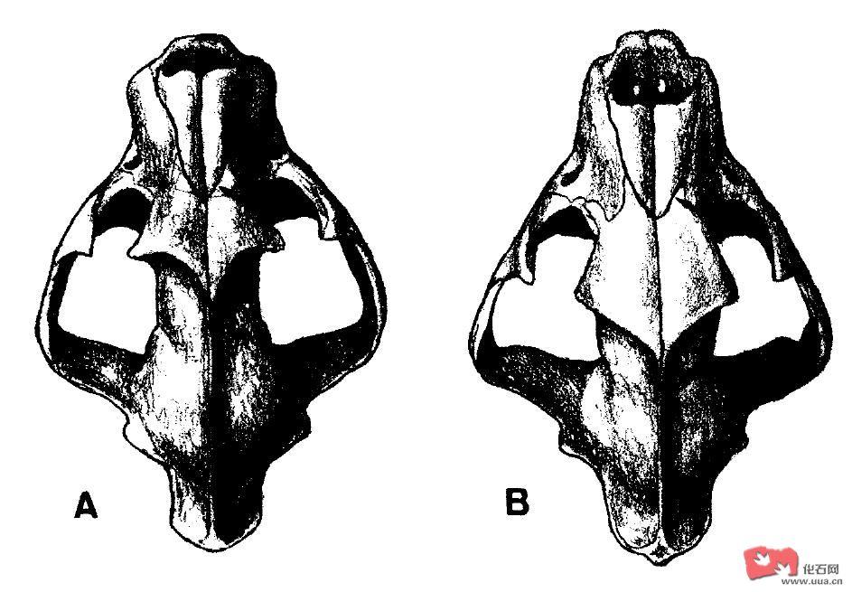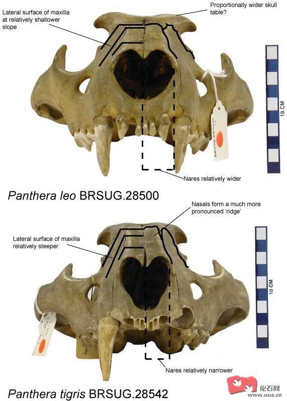 比如说这个图,左边那个头骨的鼻孔宽度是要小于两个上犬齿内侧之间的距离的.而且鼻骨非常长,很向后延伸,那么它就很可能是虎.右面那个的鼻孔宽度大于两个上犬齿内侧的距离,而且鼻骨相对较短.所以很可能是狮