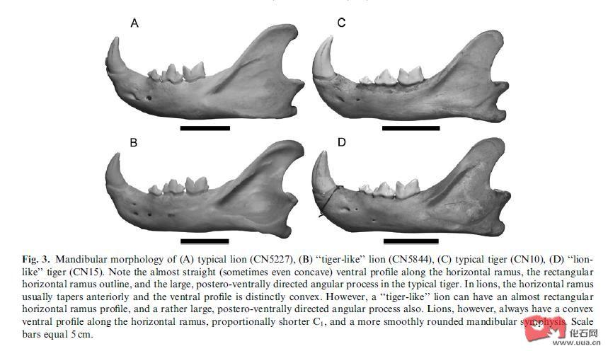 A是标准的狮子,C是标准的老虎.可以看出来,不管下颌形态什么样,按比例的犬齿的大小才是鉴定狮虎下颌的主要特征.C和D的下犬齿按比例来说,下犬齿除以下颌长度,要明显大于A和B