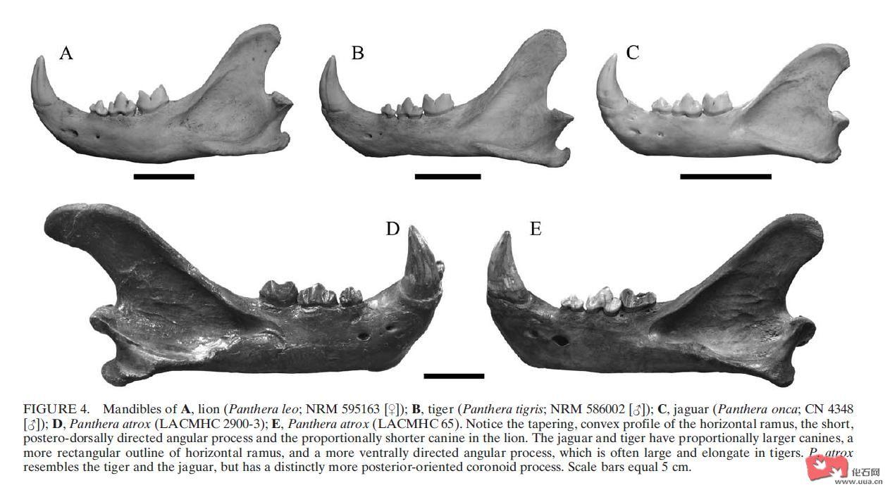 下颌对比,A是狮子,B是老虎,C是美洲虎,D和E是残暴狮.