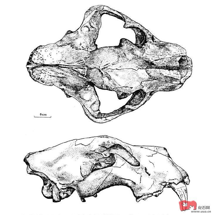 洞狮头骨素描和复原图.洞狮的头骨比残暴狮稍小.而且据说P3比残暴狮少了一个齿根,枕部也有所不同.