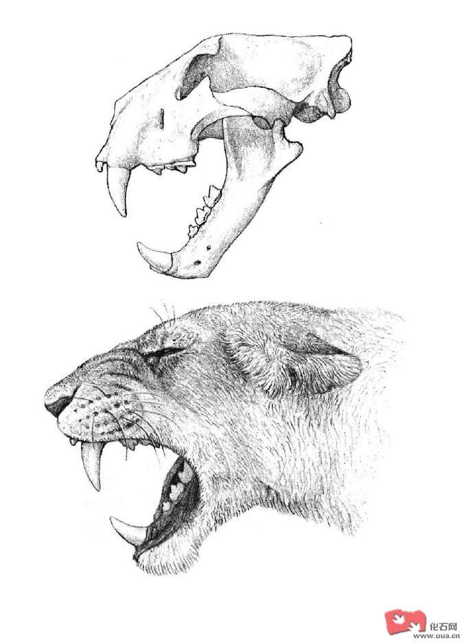 侧面观,老虎的嘴更宽导致犬齿更大,脑袋后面的矢状嵴也稍微向上翘.而且下颌底下比较平略凹,而狮子是有些凸型的.