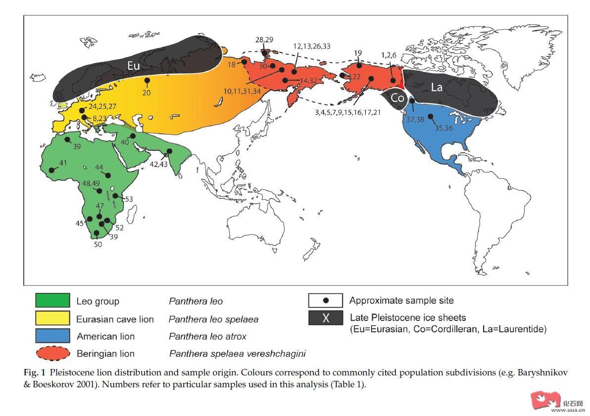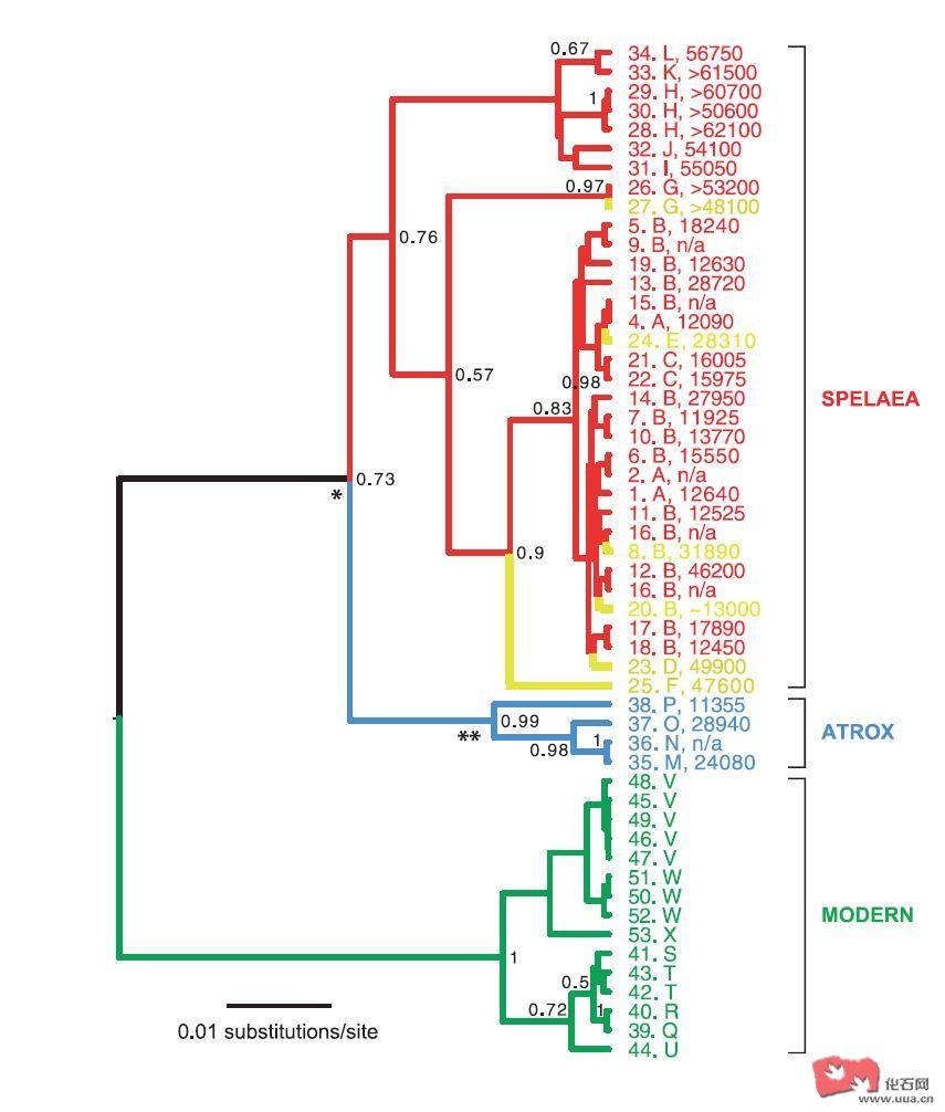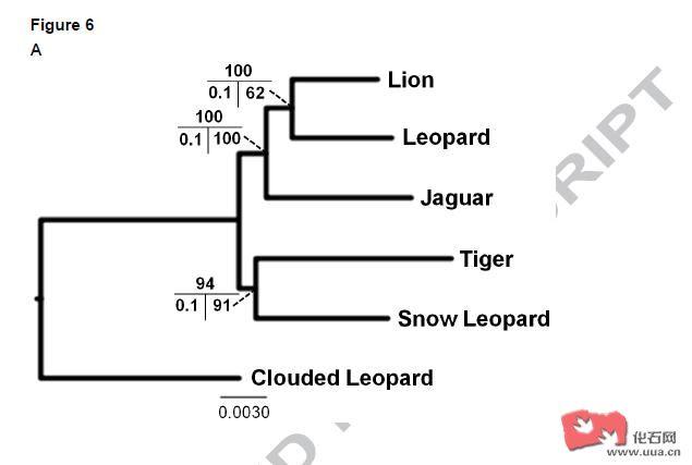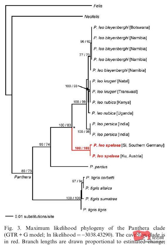 还有一张运用最大概似法(Maximum likelihood)得出的Panthera发展史。可以看到洞狮与其他狮亚种之间的关系,也暗示了豹和狮是Panthera属里最晚分化的种。