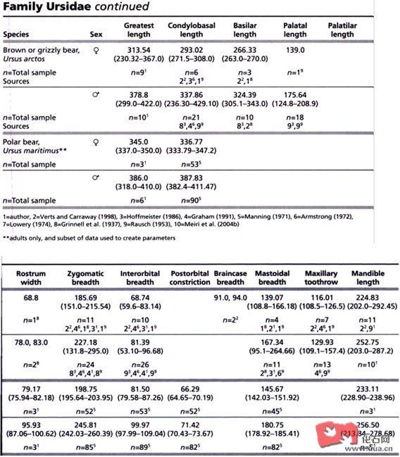 首先上一张测量表,其中北极熊的头骨测量数据出自Elbroch(2006)和Manning(1971)