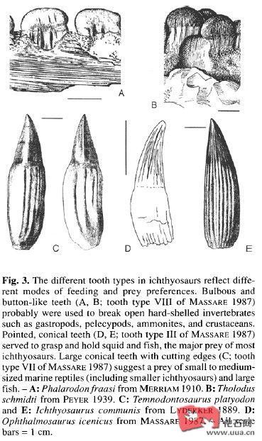 而Phalarodon fraasi(可能也包括Mixosaurus nordenskioeldii)则可满足上述要求,它们可能更主要的以硬壳生物为食