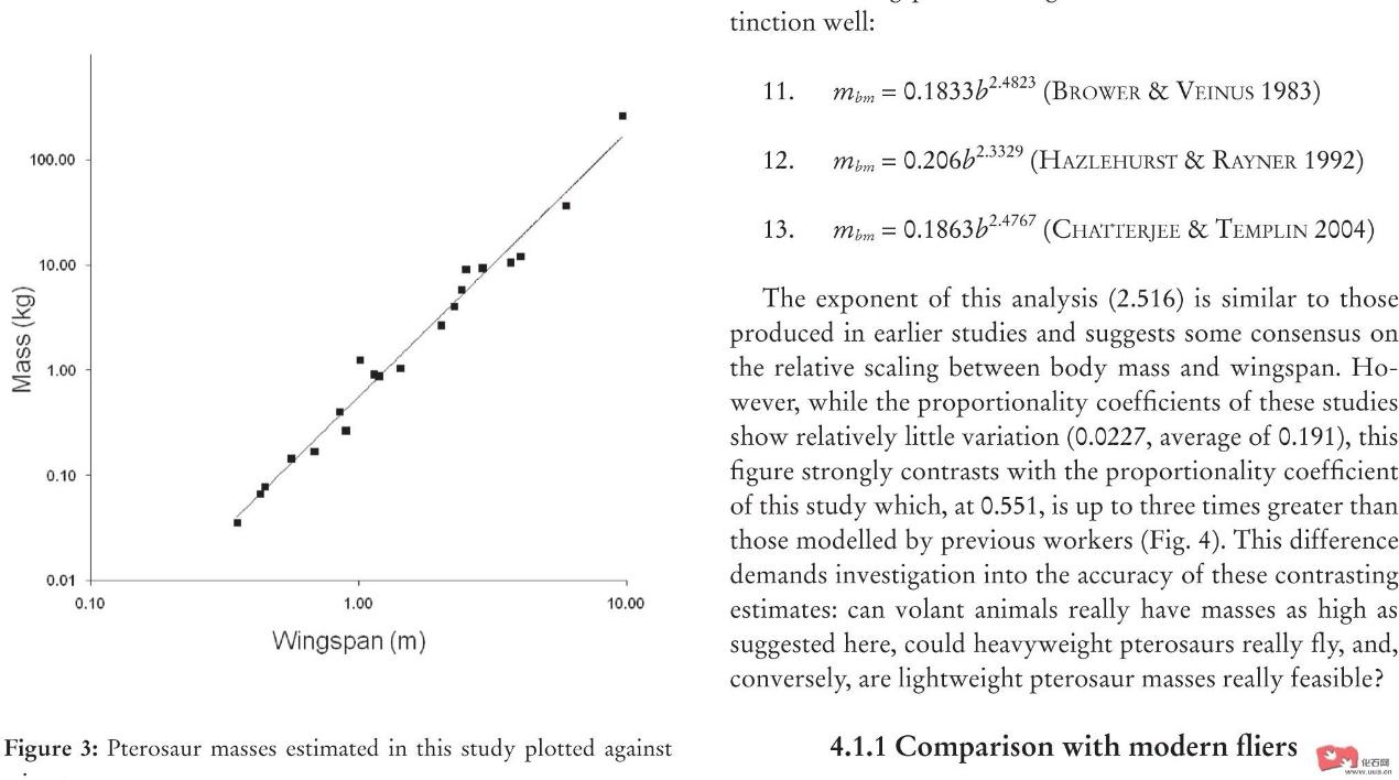 3.体重(kg)= 0.55(翼展)^2.516,粗略估测,低估大型翼龙体重