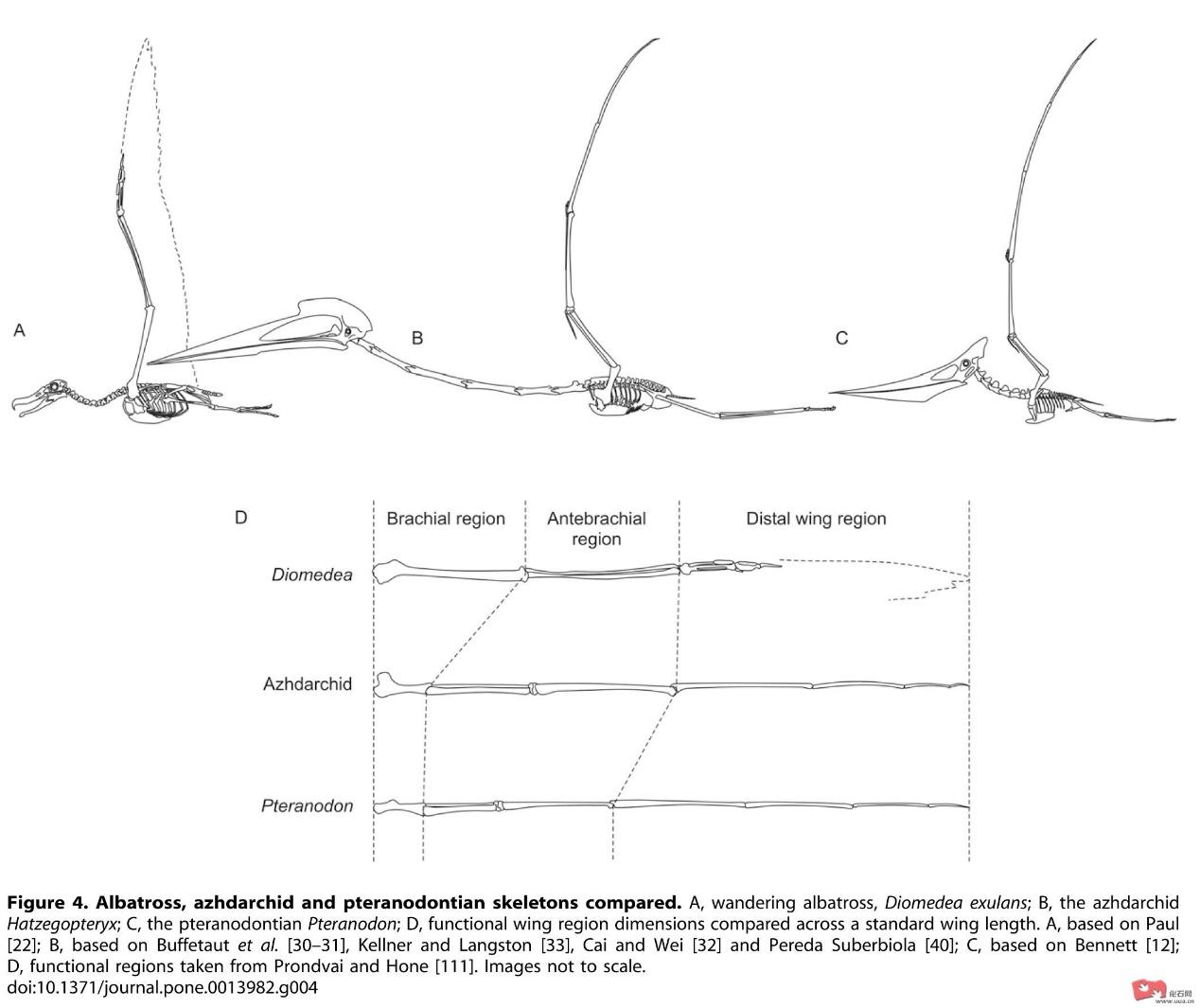 这个才是正确的北之风神翼龙模型(根据同属小标本重建),上图不是按比例画的,胸腹部明显比Henderson的短,上图还有风神翼龙,无齿翼龙和信天翁的翼展结构比例图
